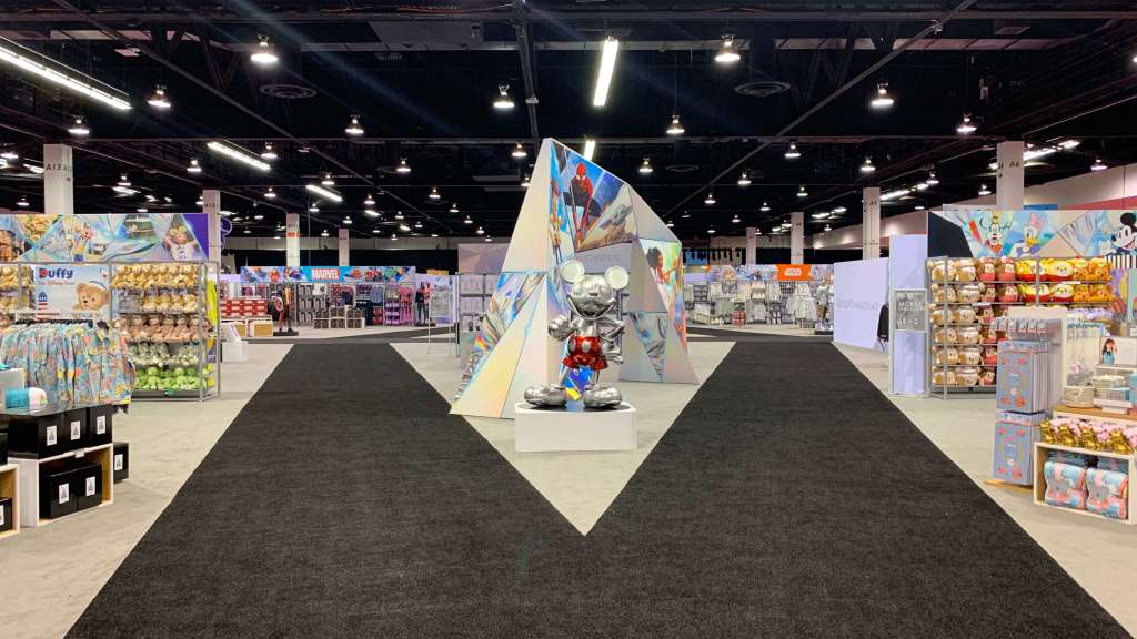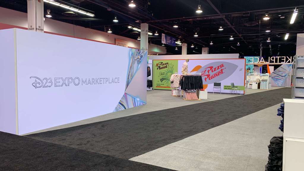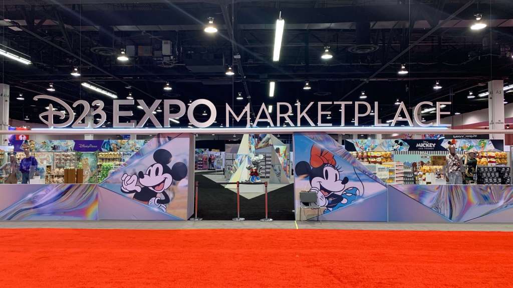 Comprehensive large-format graphics production for Disney’s D23 Expo Marketplace, spanning exterior signage, interior environmental graphics, and branded retail booth installations across a major convention space.