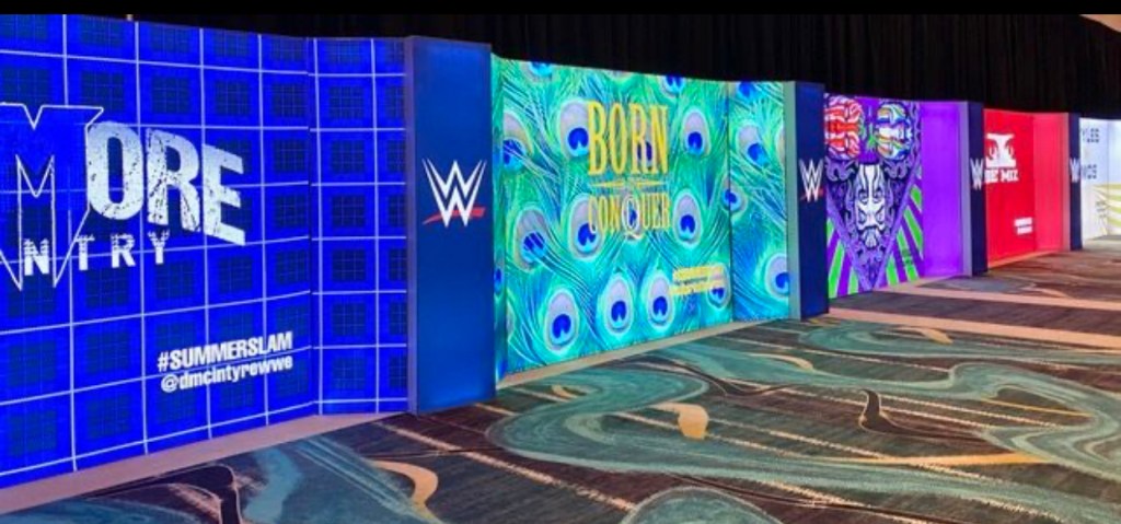 Project Overview: Large-format environmental graphics for WWE SummerSlam event, including championship belt merchandise display booth, branded Instagram photo opportunity backdrops for talent meet-and-greets, and SEG (Silicone Edge Graphics) frame installations.